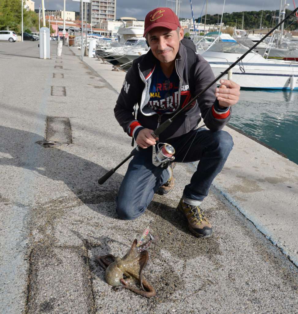 Nous poursuivons notre power fishing consistant à pêcher tout en avançant. La façade nord du port présente de fonds peu important et vaseux et nous décidons de passer au coté est qui présente des fonds plus rocheux. La décision était bonne puisque 5 minutes après notre arrivée, un poulpe sort de sa cachette et fait un bon impressionnant pour s’emparer de la turlutte. Il est arraché d’autorité de sa pierre et immédiatement tiré hors de l’eau.