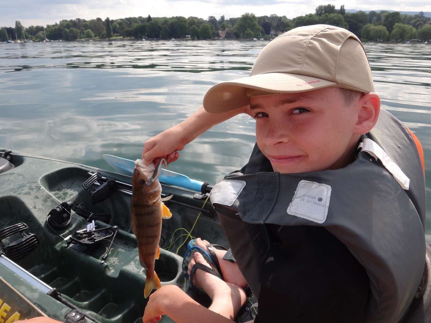Apres le repérage faut aller les chercher ! Petite sortie kayak avec le fils d'un collègue, 11 ans et déjà passionné ! Je lui passe des valeurs sûr pour le Leman, "Swimming ribster", "Swim fish" et "Grubster" de chez LUNKER CITY. Le tout monté sur des tp LUNKER CITY "Football" ou bien des FLASHMER "Poisson" et "Skud". Après quelques conseils sur la méthode de pêche il fera 1 jolie perche et 2 brochets, ses plus gros poissons, chapeau !