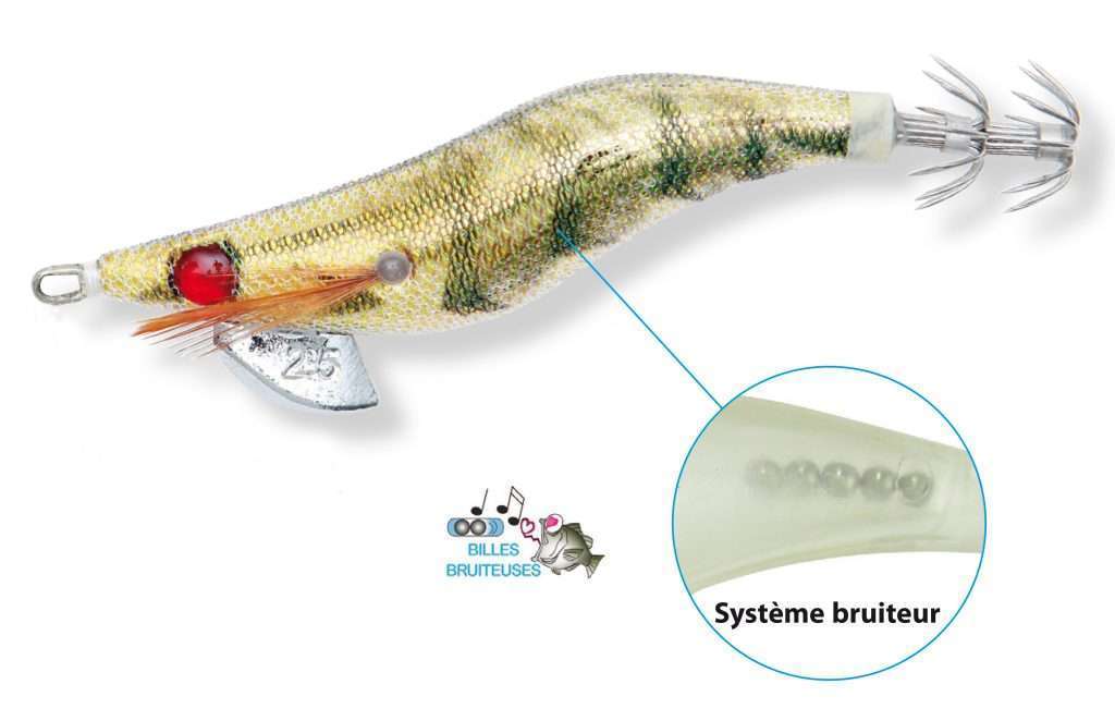 - Plumes de qualité : les plumes latérales dirigées vers l’avant servent à ralentir la plongée de l’egi simulent les ouïes et les nageoires d’un poisson. Elles émettent des micro vibrations particulièrement attractives pour les céphalopodes.