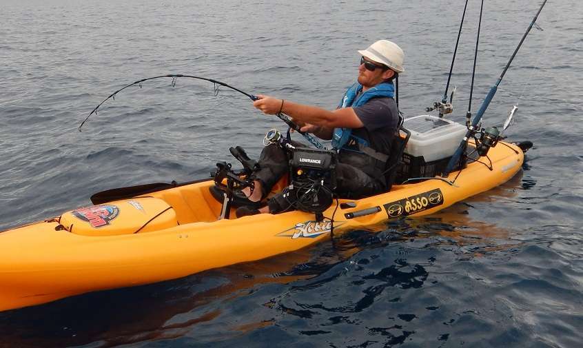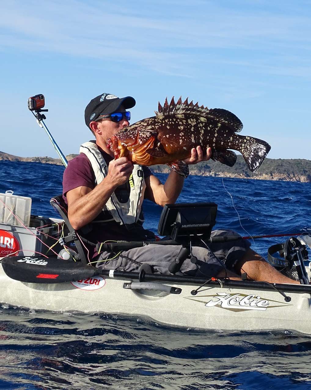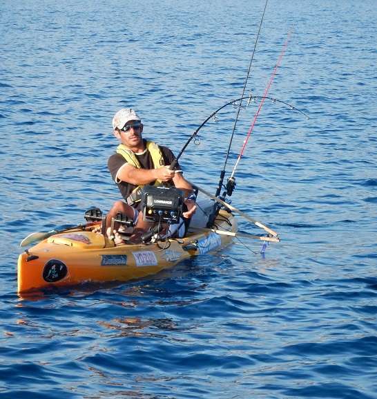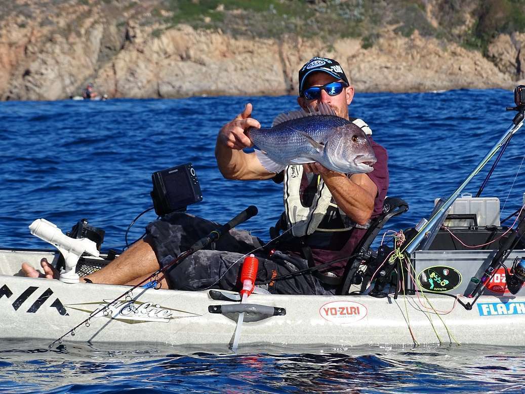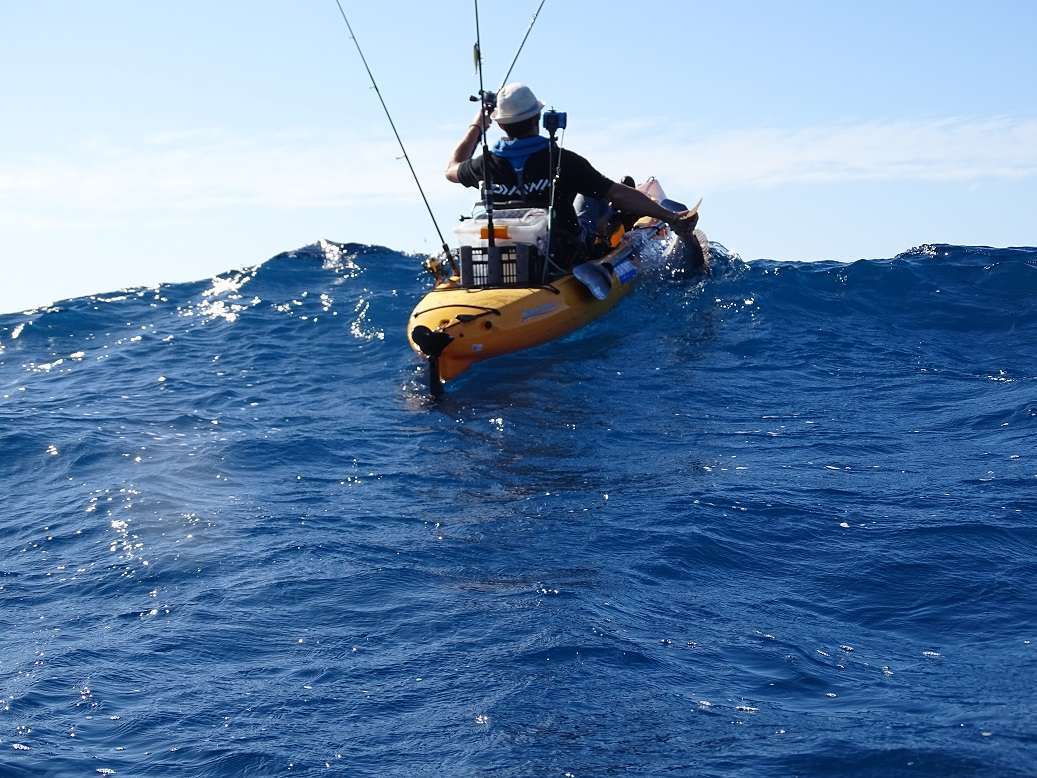 Puis arrive le dernier jour, Vincent n’a toujours pas fait de sériole et il commence à bouillir. J’essaye un peu les dentis et j’en prends un beau, pendant ce temps il traîne son vif dans la même zone car nous voyons régulièrement de gros échos sur nos sondeur. Et ça y est je l’entends qui annonce « POISSON », rapidement je vois son kayak se faire traîner, nul doute qu’il tient là un sérieux client !