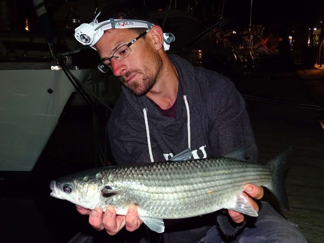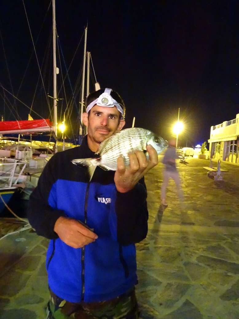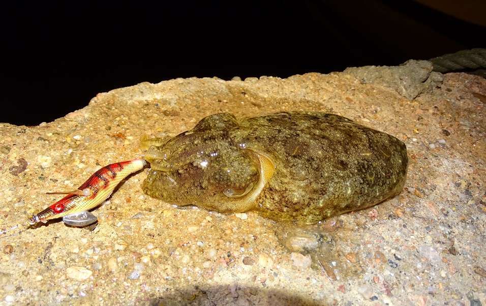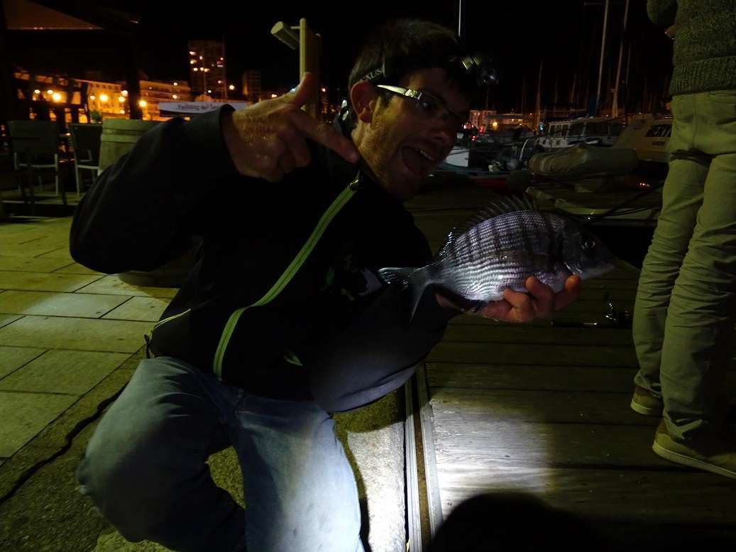 Contre un quai j’aperçois une seiche, j’appel vite François pendant que je troc mon ls contre une Sea shell 1.5, je lui passe la canne et le reste n’est qu’une formalité