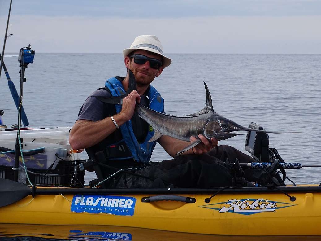 Quelques instants après c’est Colin, qui est plus au large, que nous entendons crier. Je le rejoins aussi vite que je peux et constate qu’il tient de nouveau un espadon ! On prend vite quelques photos puis Colin le laisse retourner prendre quelques dizaines de kilos 😉