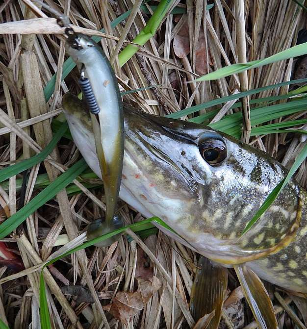 Mais le montage que je préfère pour ce leurre c’est l’association à une tête plombée Flashmer « Poisson » , en coupant un peu l’avant du leurre cette tête lui va comme un gant et la nage obtenue est superbe. Pour le brochet je le monte avec des grammages de 3/9gr dans les fonds de 1 à 8m et des têtes de 7 à 21gr dans plus d’eau ou si j’anime rapidement. Je place toujours un assist avec un triple Maruto n°8, sur le dos ou le ventre du leurre selon l’encombrement du fond (voir la vidéo Montage d’un stinger).