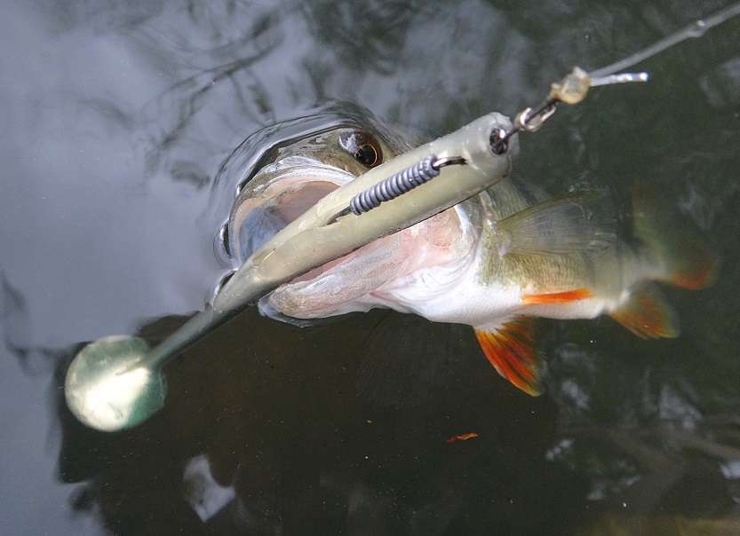 Pour la perche et le sandre si le fond est propre j’utilise le même montage avec le petit modèle de 3″. Avec cette taille de Swim Fish les tête plombées Skud dans les petits grammages sont parfaites pour les pêches légères.