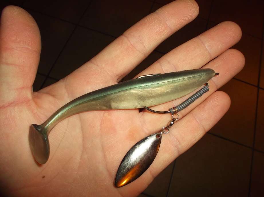 Ce montage permet de passer partout et donne au leurre un rolling superbe. Quand je cherche le sandre ou la perche en milieu encombré j’utilise le petit modèle (3″) monté avec une tête plombée texan ou bien en drop shot. (Pour tout savoir sur les montages texan je vous invite à lire ces articles: Texan part.1 / Texan part.2 )