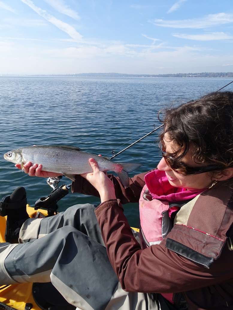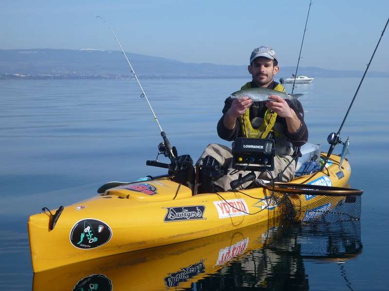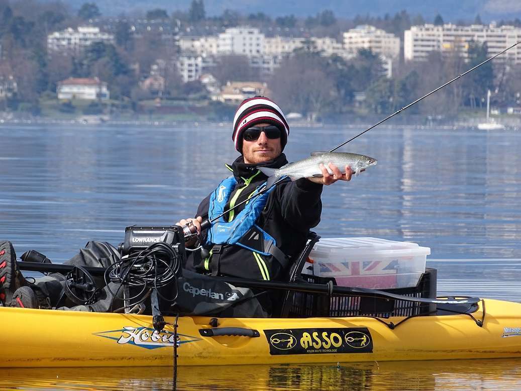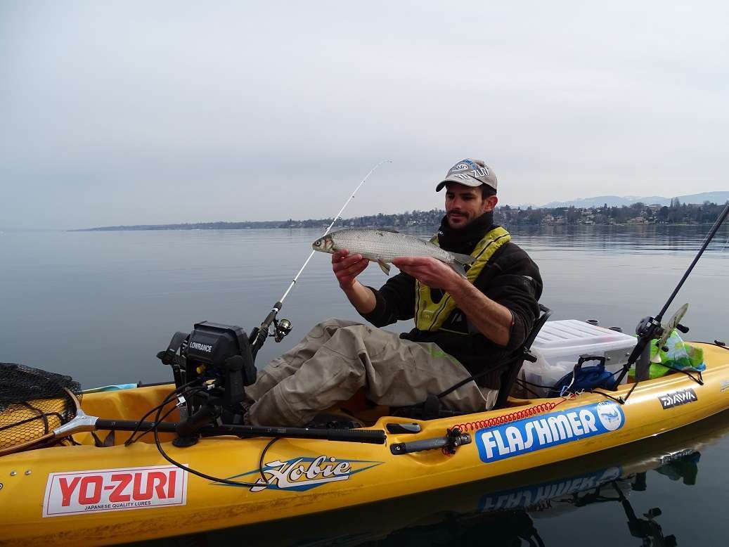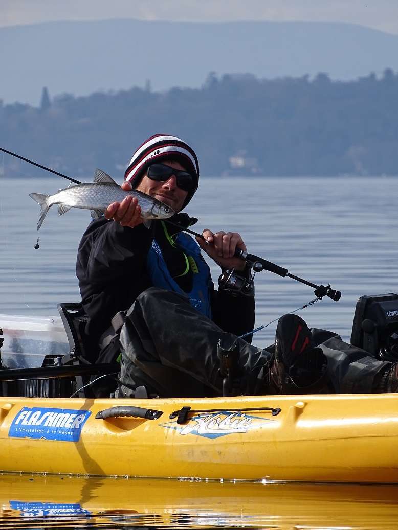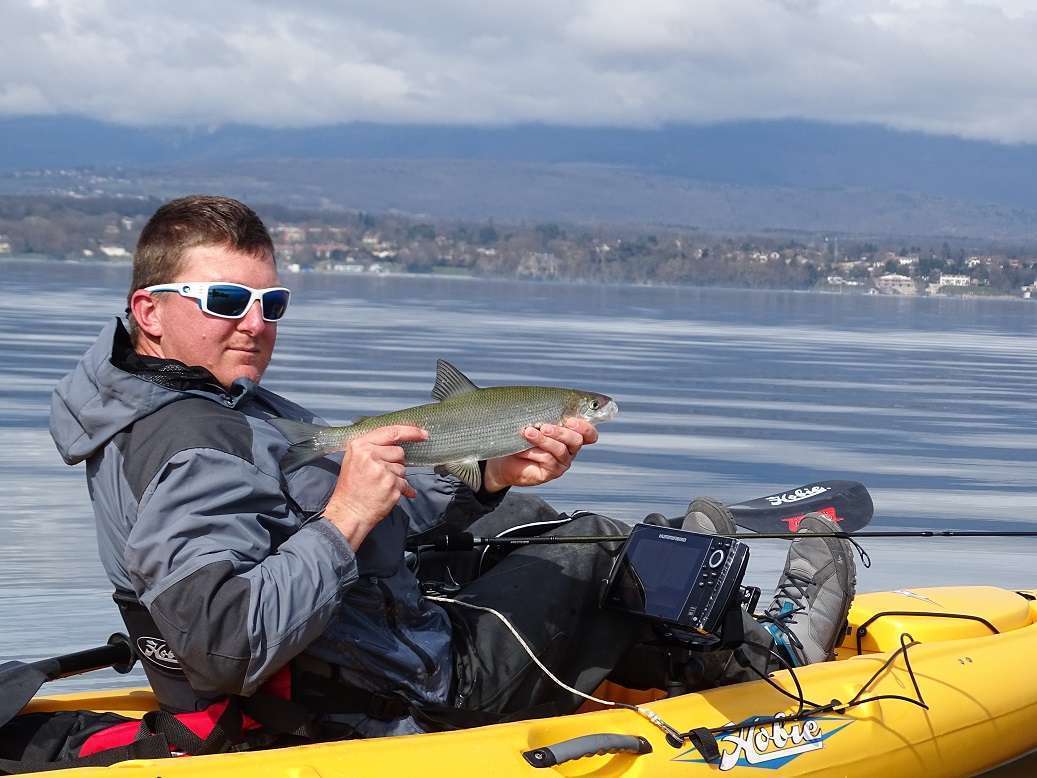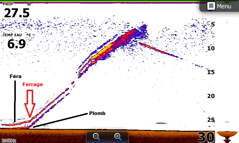 Samedi on hésite… il pleut et la météo annonce pas mal de vent. Tant pis! On n’est pas en sucre, retour au Leman, la fièvre de corégone nous tient vraiment ! On passe la matinée à pédaler contre le vent pour se maintenir à la verticale, il fait froid et nos doigts sont gelés mais on prend quelques poissons. Pas de photos avec ce temps mais du coup je vous montre quelques captures de sondeur juste avant la mise au sec. C’est vraiment cool pour cela, les féras, on pêche à « vue » et souvent on prend un poisson que l’on avait vu venir sur la ligne. Parfois avec même le luxe d’annoncer la prise avant même qu’il morde ! (enfin parfois on se prend de bons gros refus quand même…)