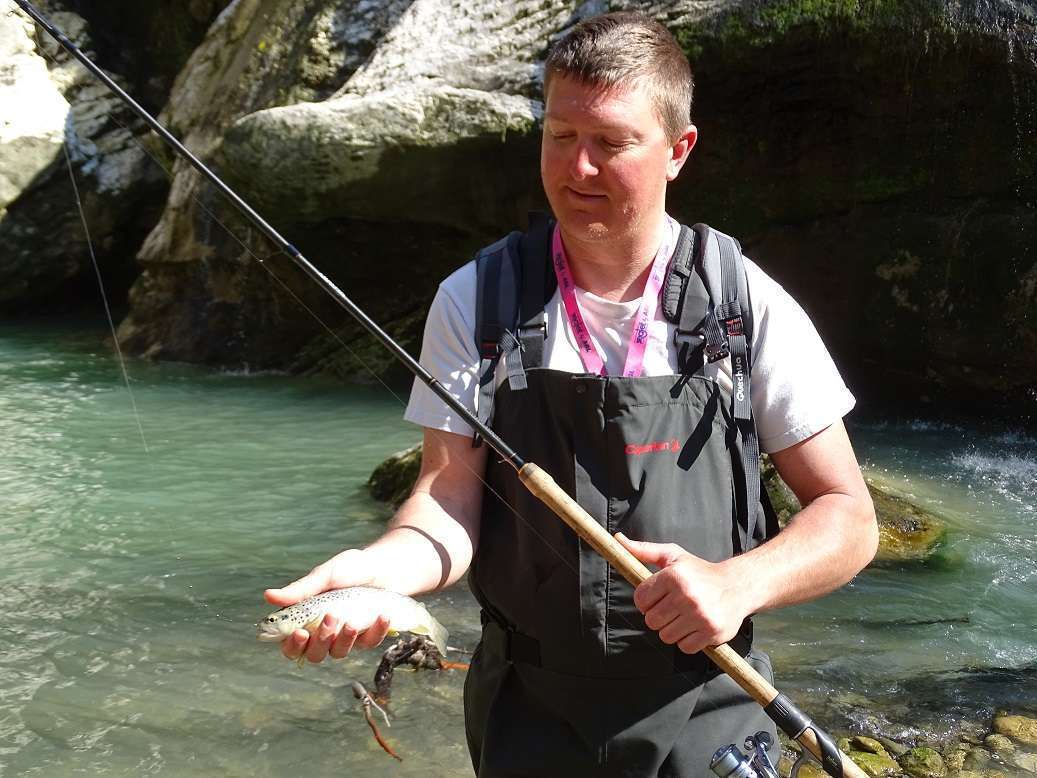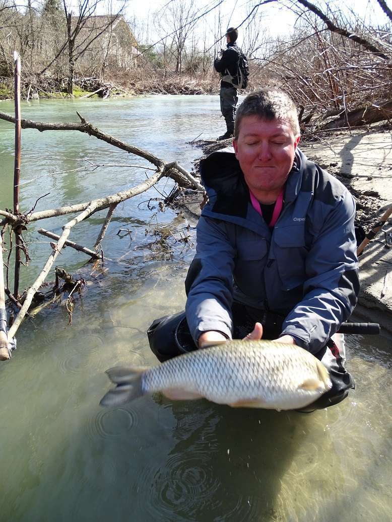 J’explique les subtilités de la pêche au bouchon en rivière en guidant Olivier qui après quelques trous sans touche sort finalement un chevesne, assez peu coopératif pour la photo !