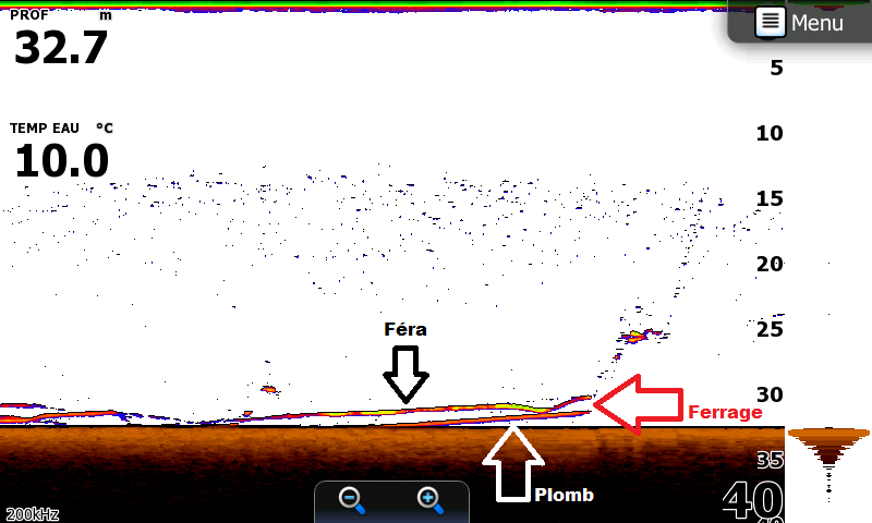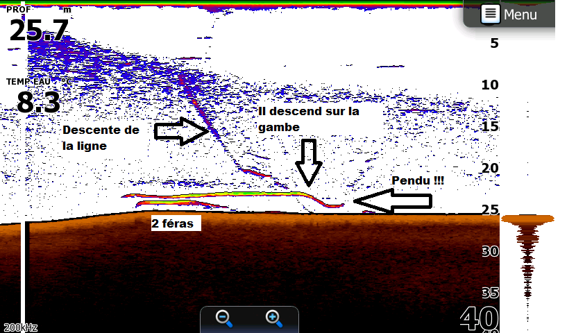 On comprend aisément pourquoi il faut que la ligne descende le plus vite possible dès qu’un écho apparaît. En utilisant une ligne fine on n’a pas à lester plus la ligne et on maintient plus facilement la ligne à l’aplomb de la canne. Colin utilisait pour la 1ere fois la tresse Asso Micro Braid 8x et franchement elle est top ! Le diamètre 0,06 mm fait presque peur tant il est fin mais pas de soucis et aucune casse à déplorer sur la semaine.
