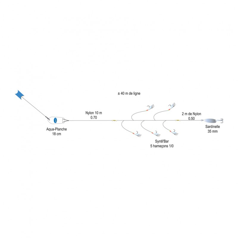 Composition: +/- 25 m of braided line, 1 float connected by a snap swivel, 10 m of 70/100 nylon beyond the leader, an anti-twist swivel connecting the 60/100 leader made of 5x white Syntill Bar (size 1/0 hooks), a 2 m 50/100 nylon leader with a mackerel spoon (size 1/0 hook).