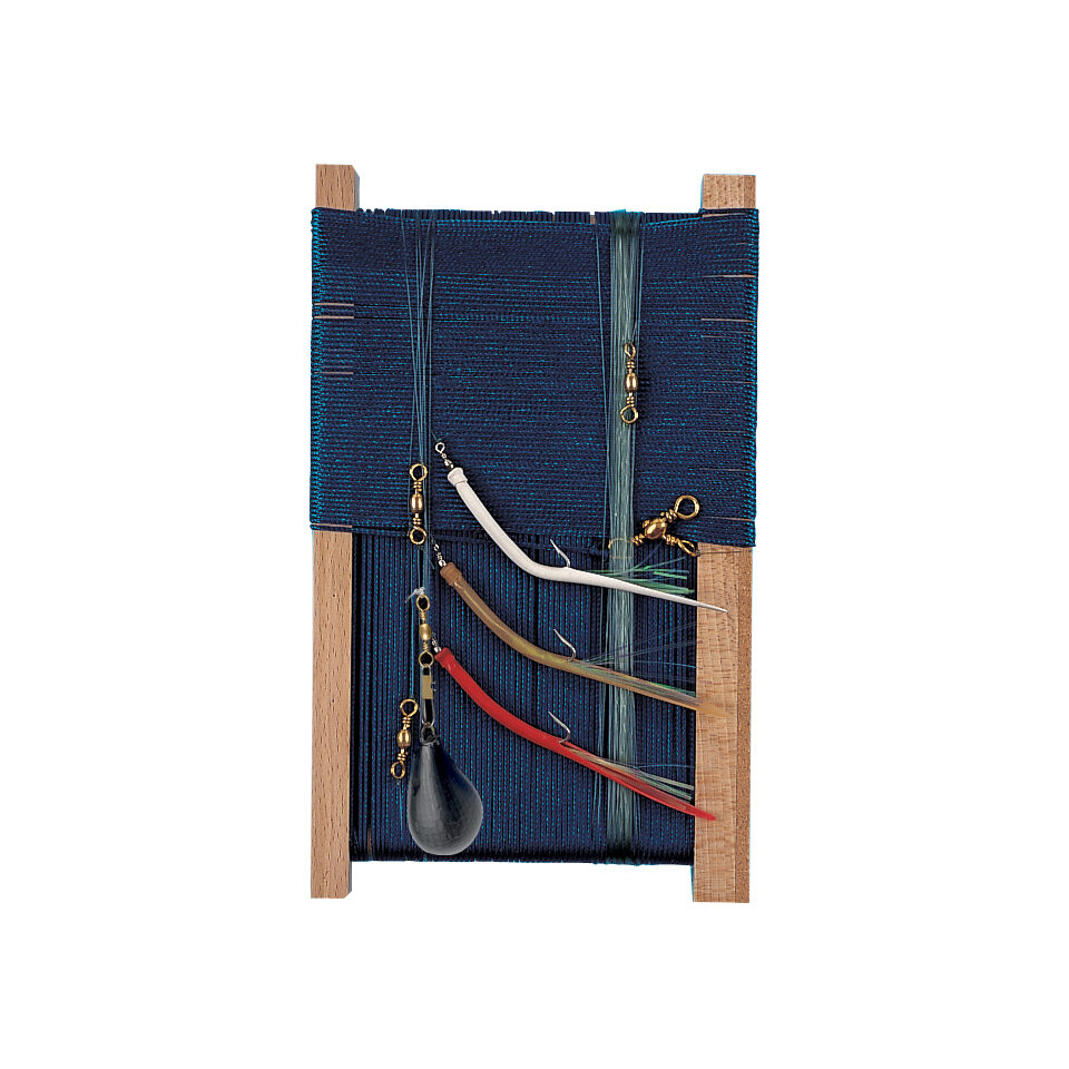 Mounted on a wooden reel with a cork strip to secure the hooks (the line is attached to the reel).