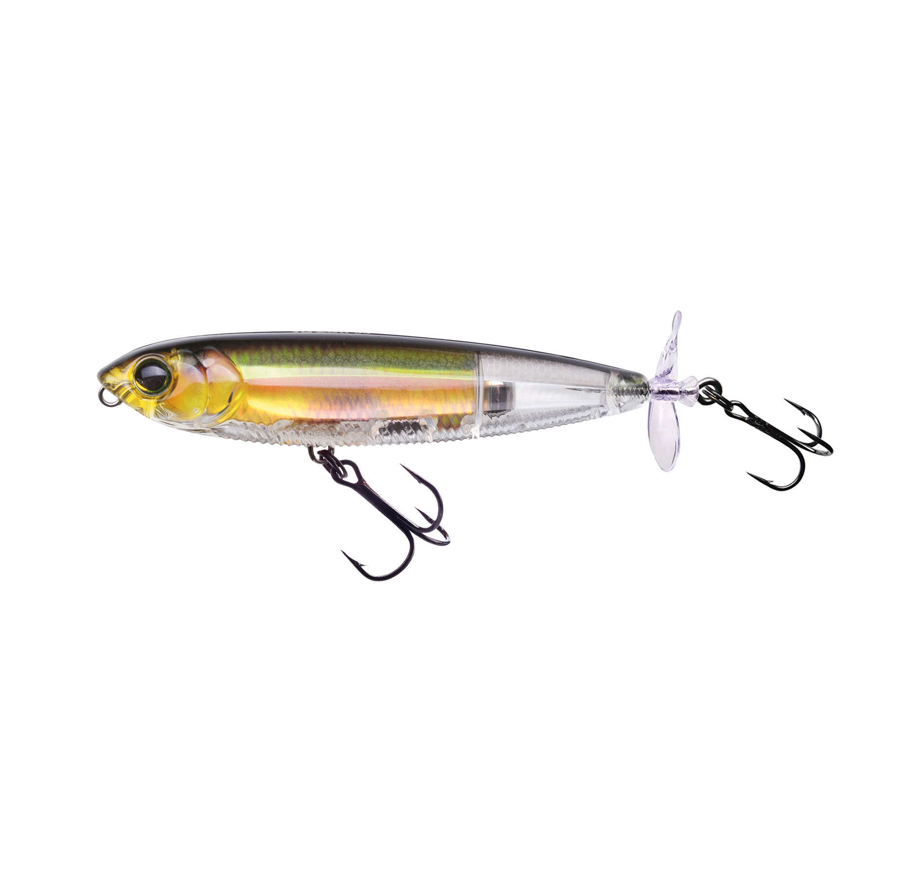 The Yo-Zuri 3DB Prop is a surface lure featuring a tail propeller that churns the water, producing a trail of attractive bubbles and a strong wake.