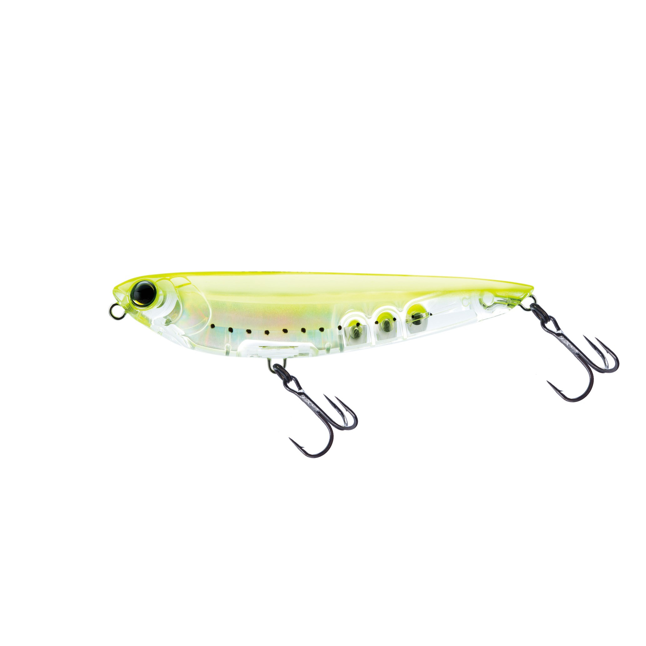 Its arched shape and very low, centrally located center of gravity give it a pivoting action on the water. By pivoting on this axis, this stickbait has the extraordinary ability to turn almost on the spot at the slightest tug.