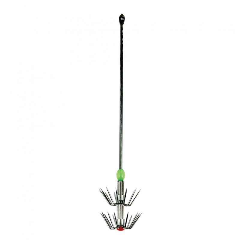 Stainless steel jig with a hook: designed to hold a live bait fish (sardine, sand lance, goby) or a cut piece of bait (squid, fish, meat)