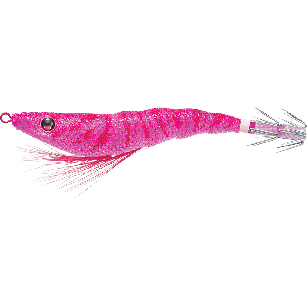 A squid jig-style lure that perfectly mimics a shrimp. Measuring 95 mm in length and weighing 6 g, the Ez Slim Cloth reacts to UV light and emits green, purple, or blue luminescence depending on the color.