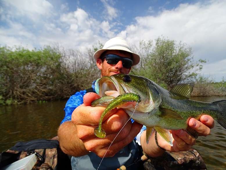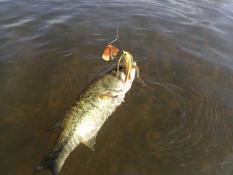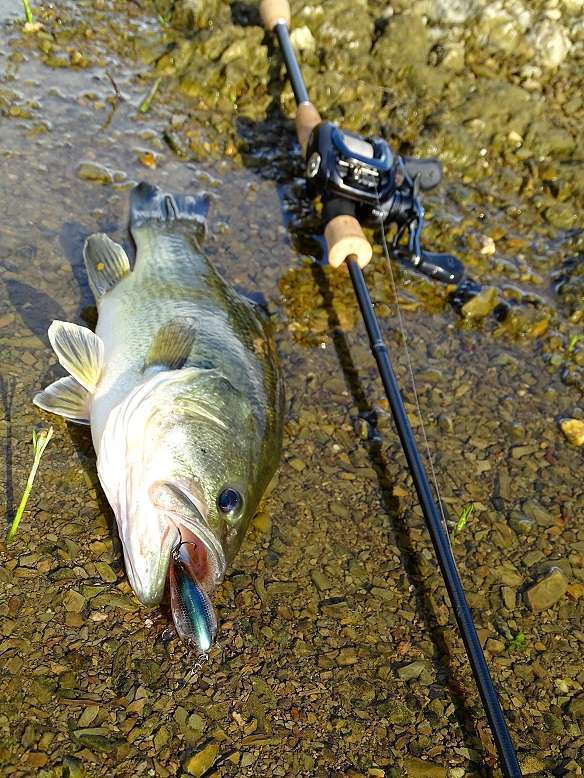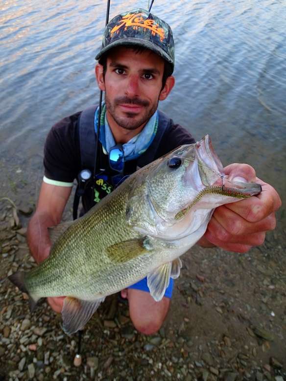 Pour peigner une berge abrupte je fais une entorse au régime top-water et monte une Craw Chunk en texan, choix payant puisque je prends mon plus joli poisson de la journée.