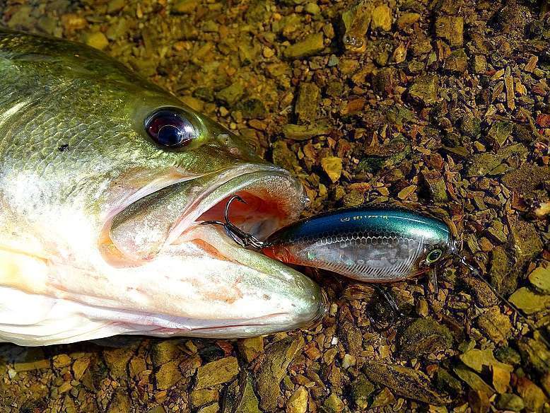 Colin monte un gros modèle qui brasse fort en surface dans l’espoir de déclencher un beau poisson. Bon choix puisque son 3DR Wake bait de 7cm est gobé par le plus gros bass du séjour !
