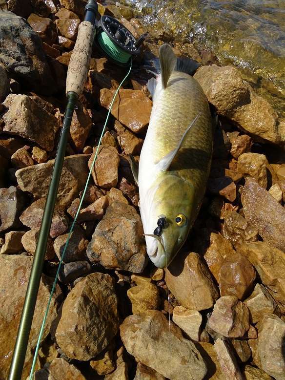 Après avoir décroché un très beau bass de plus de 50cm je me console avec ce spécimen à qui il manque 1cm pour passer la barre mythique mais qui représente mon nouveau record mouche.
