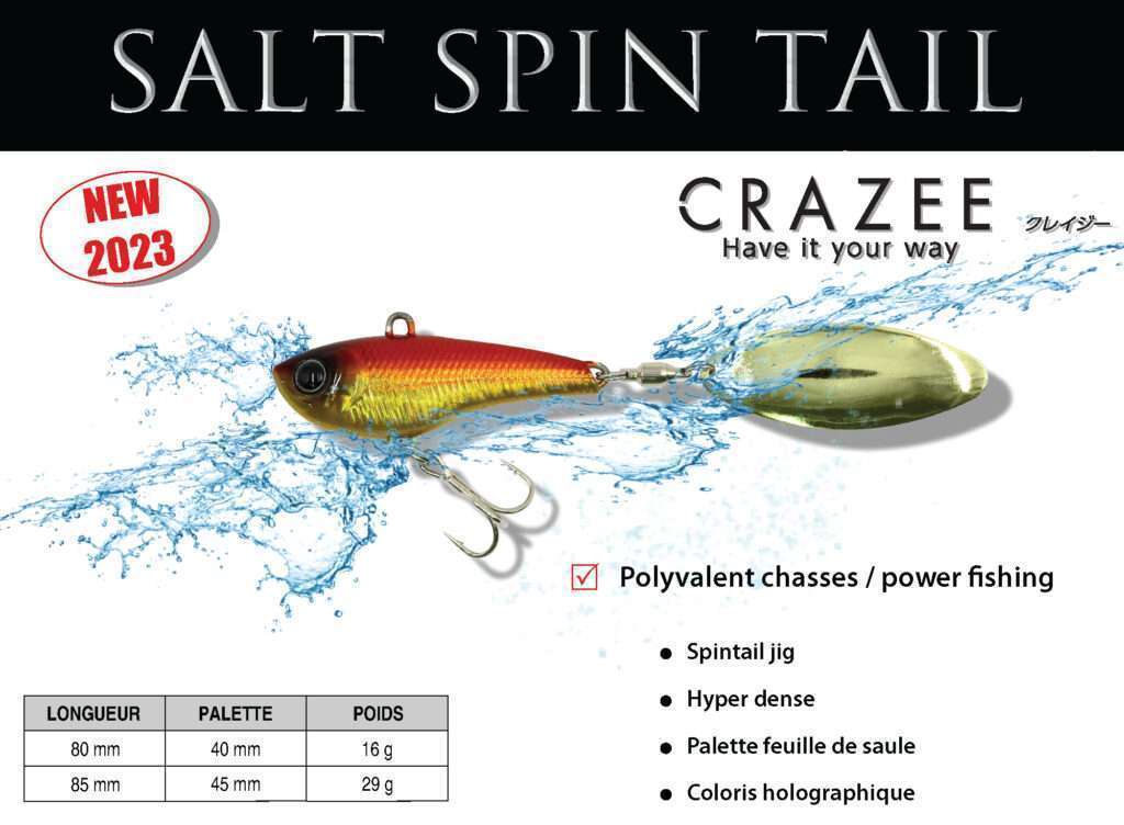 Le Salt Spin Tail Crazee  est un leurre de type spintail jig avec un corps en plomb associé à une palette en feuille de saule. L’émerillon rolling à billes offre une parfaite rotation de la palette dés le contact avec l’eau. Elle émet alors de très intenses pulsations et produit d’intenses flashs lumineux qui attirent les prédateurs sur de grandes distances. Les vibrations ultra puissantes de la palette se retransmettent directement dans le corps du leurre et le font trembler intensément (shivering). Ce spintail jig fonctionne sur simple ramené linéaire au moulinet avec des pauses. Avec sa densité élevée permettant des lancers hors norme, le Salt Spin Tail est donc idéal pour ratisser de larges secteurs en quête de prédateurs actifs (power fishing) – aussi bien en eau douce que pour les pêches en mer. Il sera possible de prospecter très efficacement différentes profondeurs avec la technique du count down – mais encore plus profondément qu’avec les Metal Vib. Le complément parfait de vos lames ! Sa grande densité en fait également un excellent leurre pour les pêches sur chasses (bonites, bars, etc.)