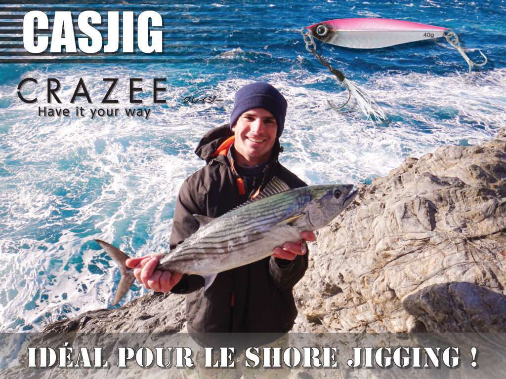 Le Casjig Crazee  est un casting jig hyper dense et compact permettant des lancers records – même face aux vents. Son profil avec des facettes très marquées le rend ultra réactif. Il effectue des jerks de forte amplitude au moindre twitch. Grâce à son équilibrage central et ses cotés anguleux, il papillonne fortement à la descente de façon très attractive. En petite taille, il est excellent en eau douce sur les perches. En mer, il est parfait pour les pêches sur chasses (bonites, bars, etc.), pour les pêches verticales (ex : traction, jigging ultra light) ou encore en shore jigging du bord en côte rocheuse.