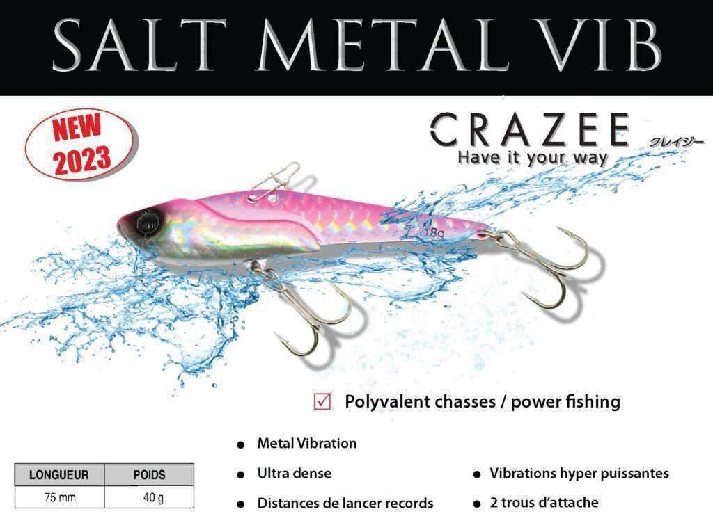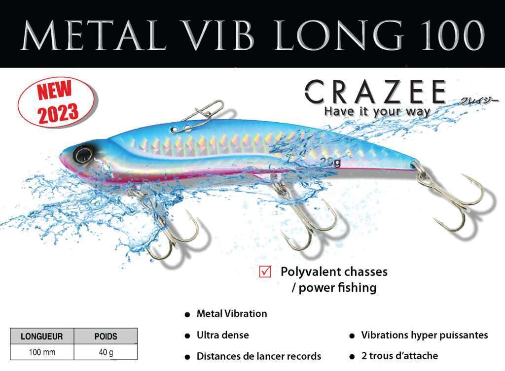 Les Salt Metal Vib et Metal Vib long 100 Crazee sont des metal vibrations nommés également lames. Avec leur corps entièrement en métal à haute densité et leur profil aérodynamique, ils sont hyper compacts et se lancent à des distances impressionnantes. Avec leur poids réparti vers l’avant et sous le ventre associé à leur attache sur le dos, ces leurres vibrent latéralement quand ils sont ramenés. Plus lourds que d’autres lames, ils émettent de plus puissantes pulsations et permettent de pêcher plus profondément. Il est possible de faire varier la vitesse et l’intensité de sa nage selon le trou d’attache. Sur le point d’attache avant, la récupération est plus rapide  (idéal pour les chasses, les zones de faibles fonds). Sur le point d’attache central, ils émettent plus de vibrations et pêchent plus profondément.