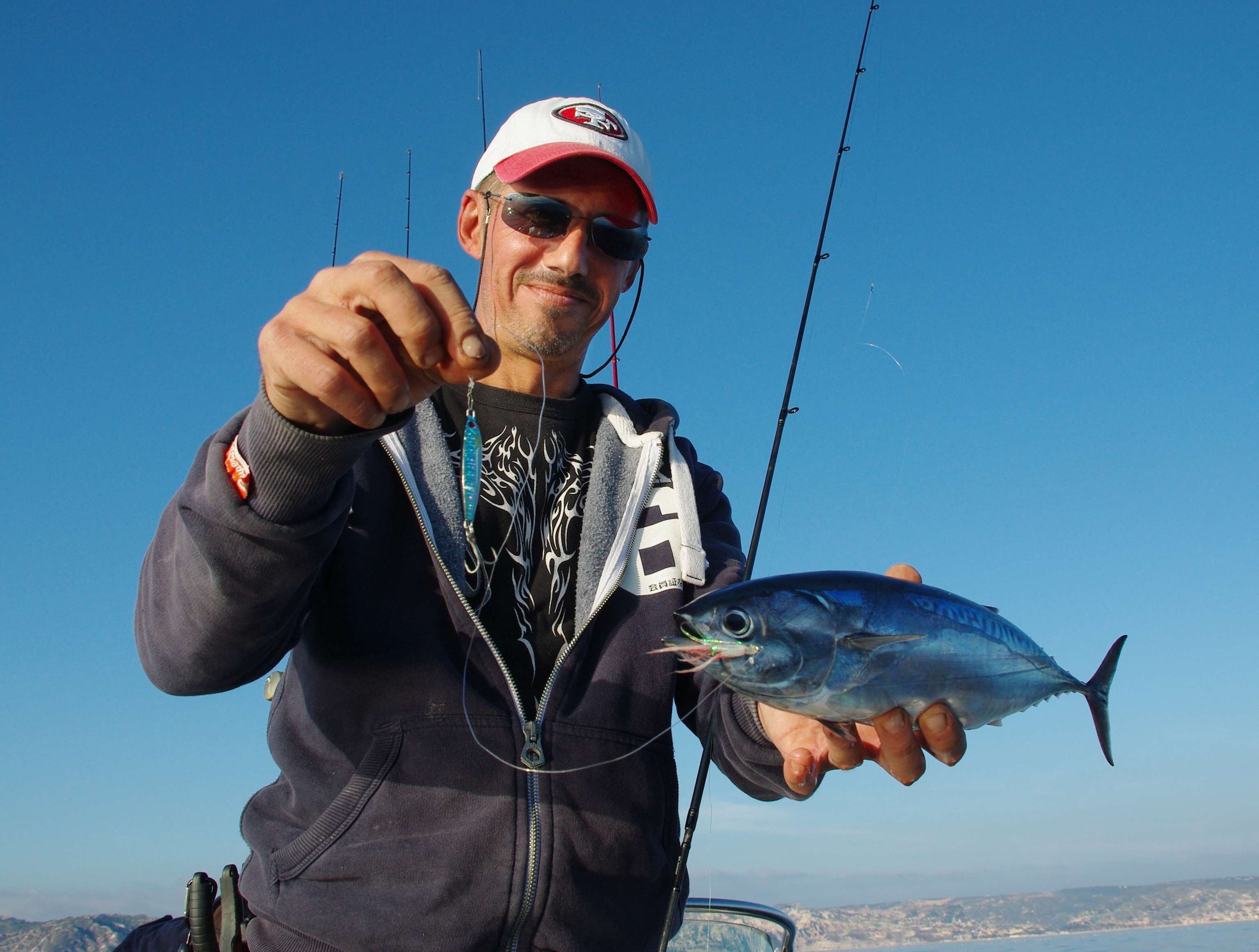 Nous sommes voisins et sortons fréquemment ensemble, mais ce jour là, nous n’avons pas pensé à nous appeler. Accompagné de deux amis, il s’en donne à cœur joie sur les bonitous et ils font même devant moi un triplé. Nous nous lançons des piques amicales et, rapidement, la partie de pêche se transforme en « battle » où chacun compte ses prises.