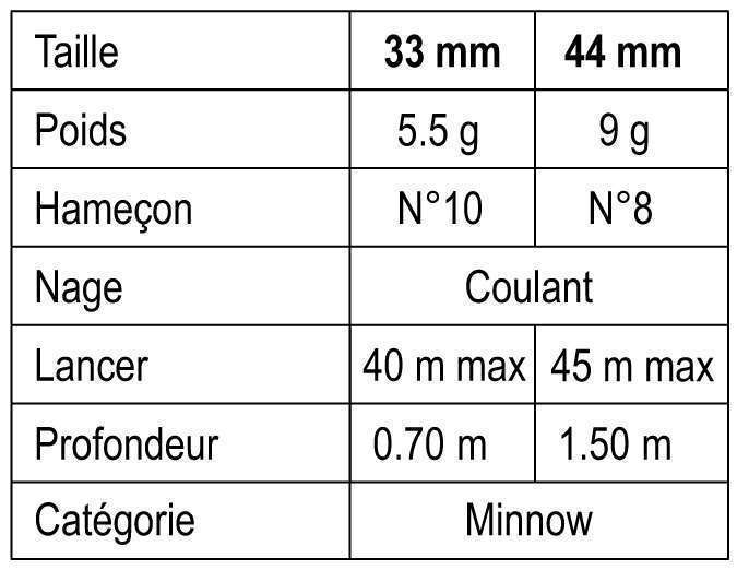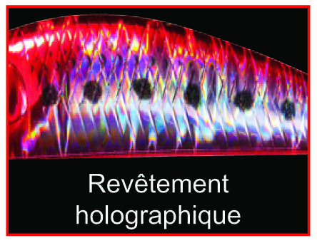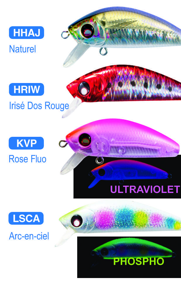 Le L-Minnow Heavy Weight offre une gamme de couleurs très aboutie. Comme son nom l’indique, le coloris Naturel est particulièrement réaliste et s’avère le plus polyvalent. On appréciera la ligne latérale horizontale bien marquée séparant le ventre holographique et le dos jouant sur les effet de transparence. Le même type de revêtement holographique se retrouvera dans le modèle Irisé dos rouge. Signalons que le coloris Arc-en-ciel est phosphorescent et que le Rose Fluo réagit aux ultraviolets visibles par les poissons.