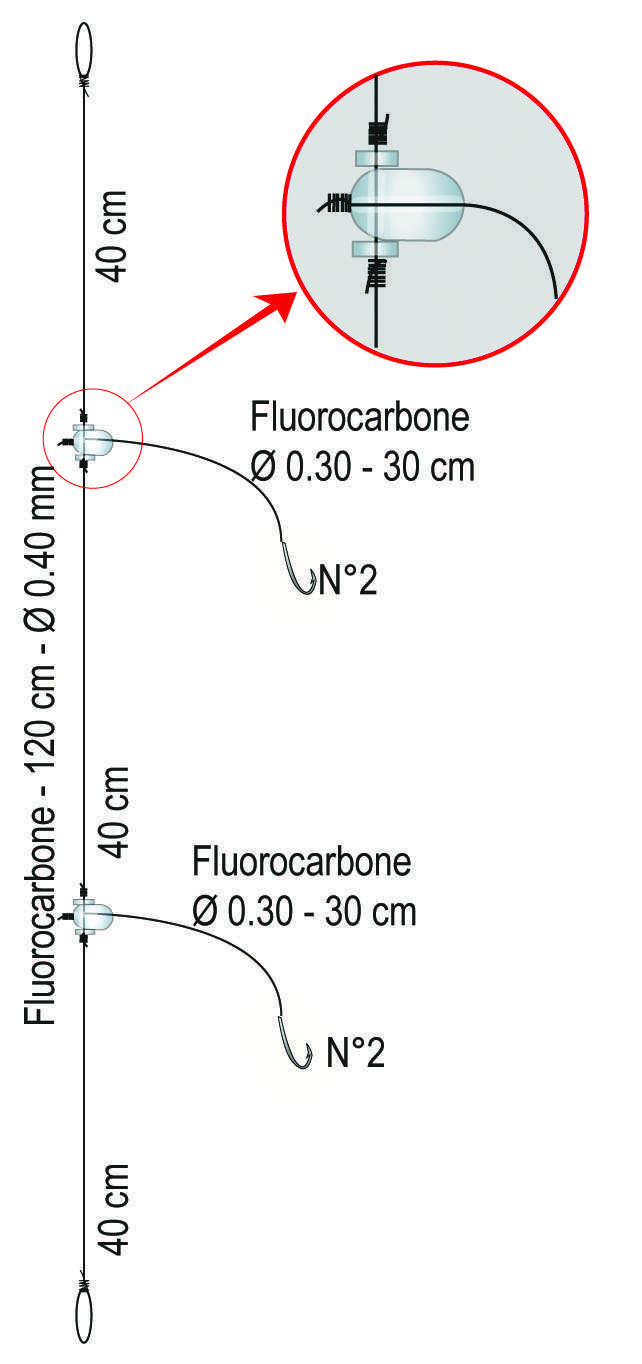 Les perles clipots de ce montage assurant une rotation parfaite des empiles ont parfaitement joué leur rôle et nous n’avons enregistré aucun vrillage durant toute notre partie de pêche. La rigidité du 30 / 100 en fluorocarbone a également participé à la bonne tenue de empiles en évitant que celles-ci ne s’emmêlent avec le corps de ligne.