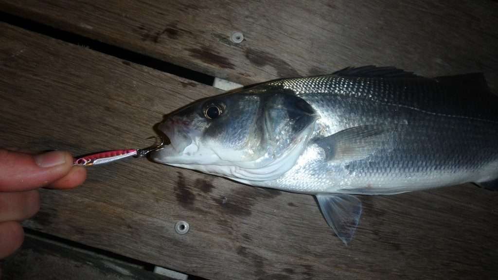 J’utilise beaucoup le Métal Spot du début de saison jusqu’à aout. Il s’avère beaucoup plus efficace que le shad qui est alors trop gros car les prédateurs sont focalisés sur les petites proies. J’ai ainsi fait en juin prés de 15 bars (dont un beau spécimen) avec le modèle 40 g coloris maquereau. Comme quoi même les plus gros prédateurs sont réceptifs à de petits leurres bien présentés !