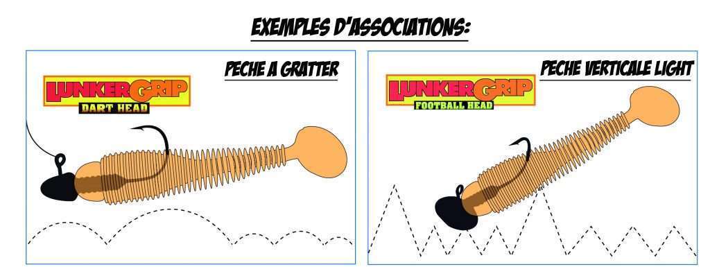 Pour les pêches en linéaires dans de faibles profondeurs, nous vous conseillons la tête Lunker Grip Dart Head qui est parfaite pour cette technique. En effet, sa conception avec une forte répartition du poids à l’intérieur même du leurre (système) apporte à votre shad un équilibrage plus horizontal. Ce système lunker Grip® composé d’annelures permet également un excellent maintien de votre leurre sans qu’il soit utile de rajouter de la colle. Enfin, le profil de la tête Dart en forme de cône perce parfaitement l’élément liquide et n’oppose que très peu de résistance lors de la récupération. Pour le Grubster 7 cm, nous vous conseillons le modèle 3.5 g.
