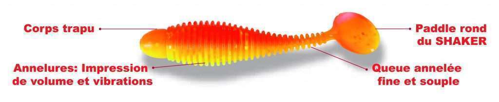 Les annelures de son corps offrent de multiples avantages. En donnant plus de volume à ce petit shad, celles-ci lui donnent l’apparence d’une proie dodue et charnue qui incite les carnassiers à l’attaquer. Quand le Grubster nage, ces anneaux créent des perturbations ainsi que des micro vortexs dans l’élément liquide qui sont autant de vibrations subtiles se rajoutant à celles plus puissantes de la caudale. Ces micro vibrations sont perçues par la ligne latérale des prédateurs et contribuent à déclencher les attaques.