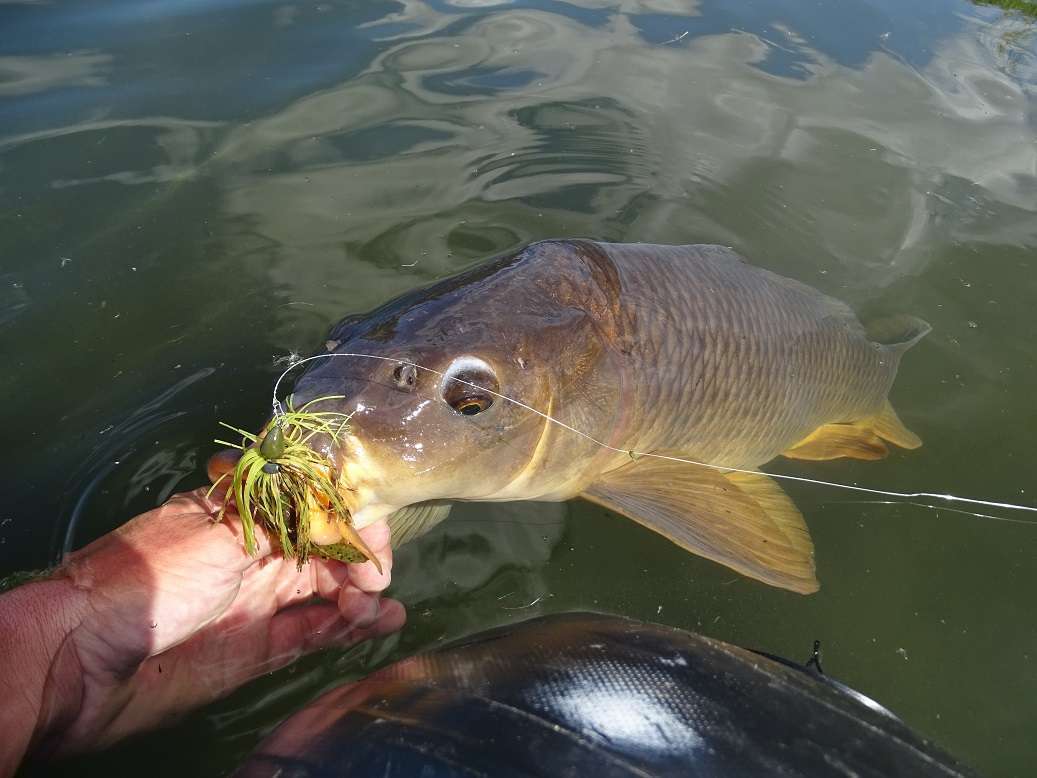 Au pied d’un arbre je prends une grosse cartouche au posé de mon jig mais au ferrage je me rends compte que ce n’est pas un bass qui a mordu sur mon Baby Boo Jig avec sa Craw Chunk. Gros combat dans les branches et c’est une commune de 70 cm que je hisse dans mon float.