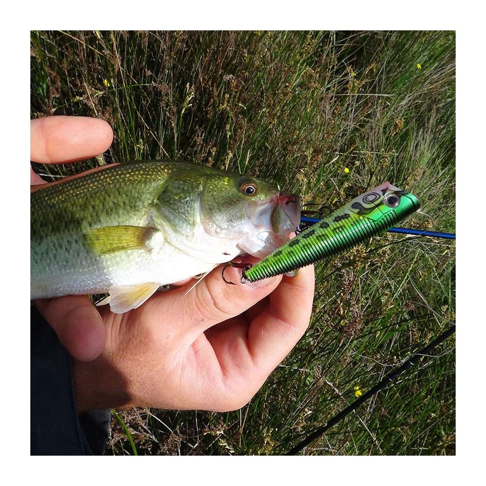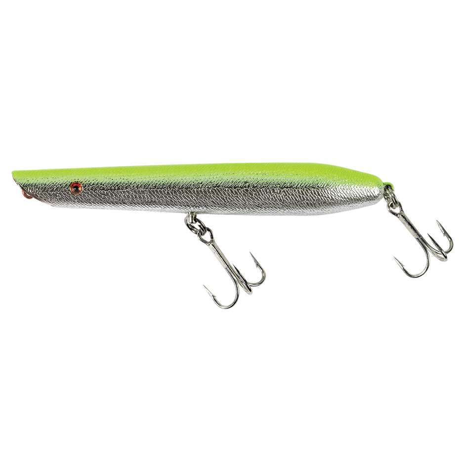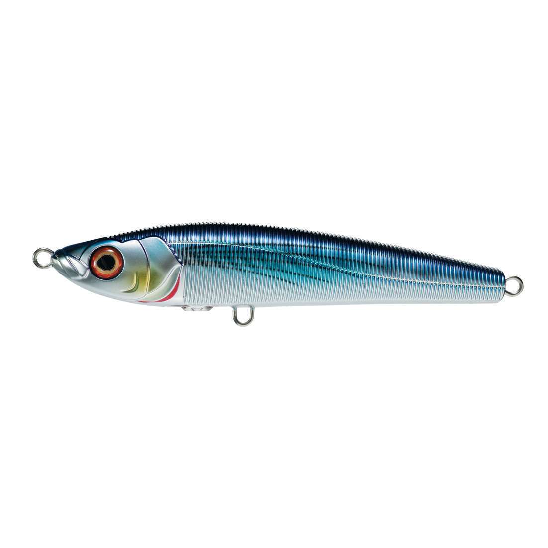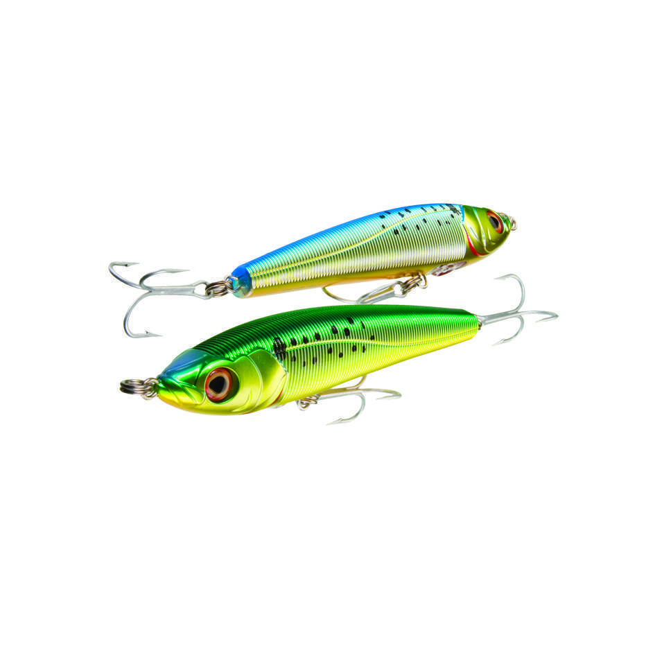 • Pencils : Ayant la même nage zigzagante que le stick bait, le pencil projette en plus de petites éclaboussures grâce à un méplat sous la tête et à son équilibrage plus plombé vers l’arrière créant un effet de bascule. Du fait de l’emplacement vers l’arrière de la bille, ces leurres se lancent particulièrement bien. Ils sont généralement longs et tubulaires.