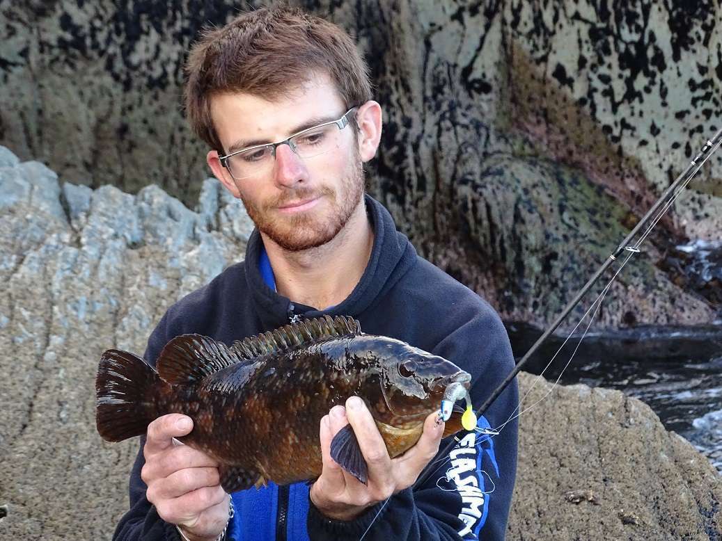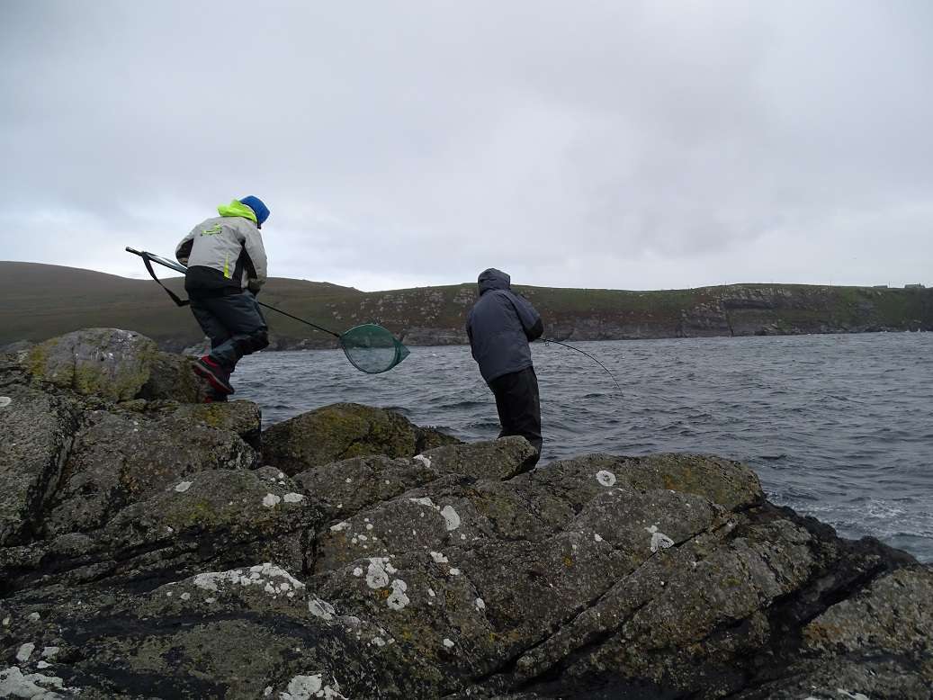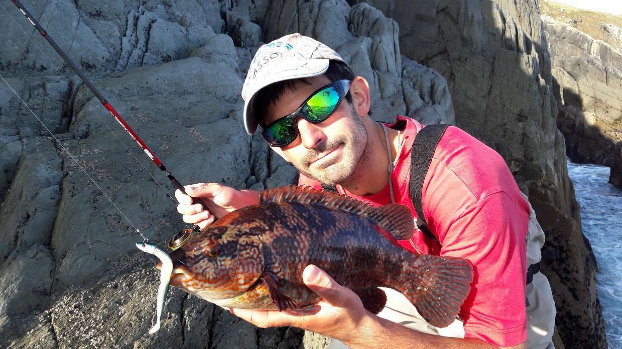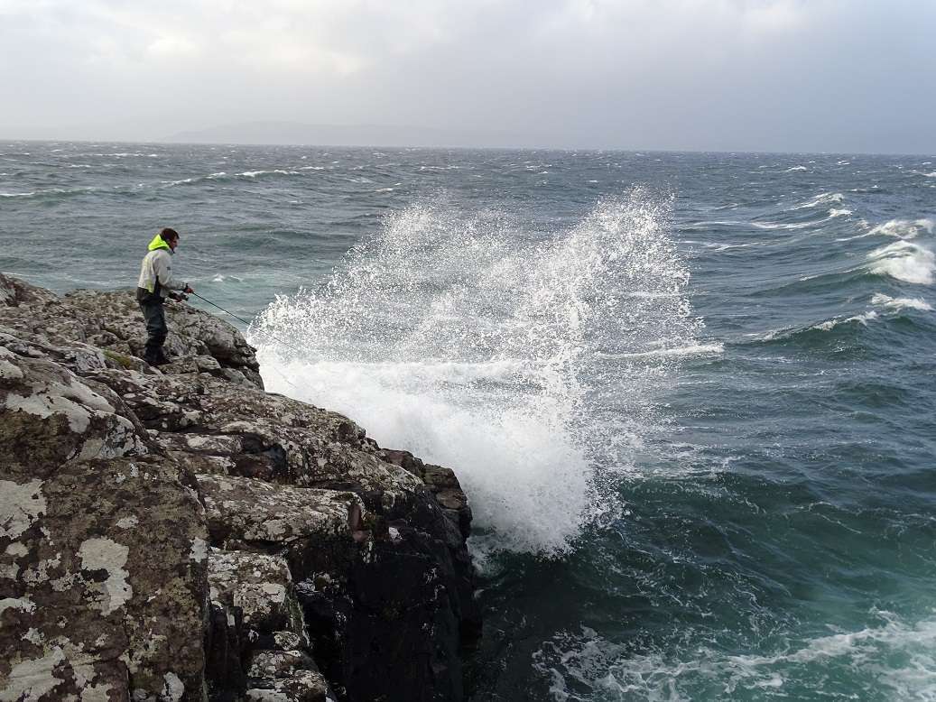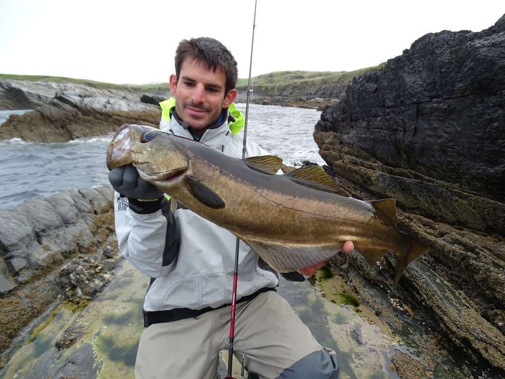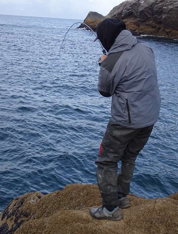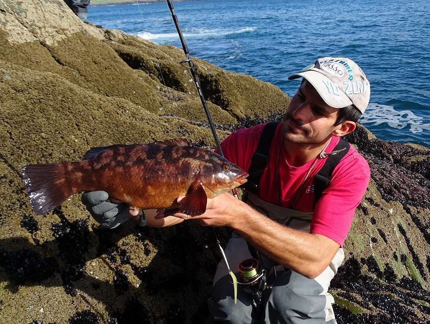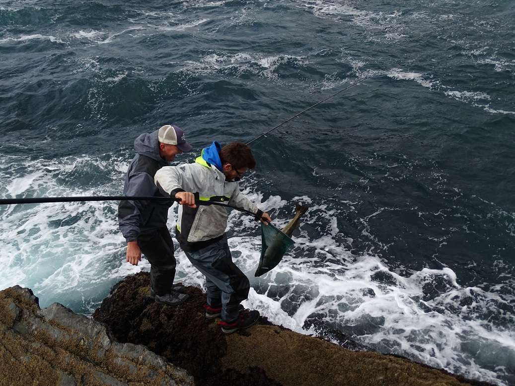 Lundi: Le vent est un peu tombé, on part pour le même coin qu’hier matin mais arrivé sur place on se rend vite compte que la houle rend le spot impraticable. En plus l’eau est très sale et chargée d’algues. Retour à la voiture, on ouvre Maps et cherchons les endroits susceptible d’être abrité de la houle. Le soucis après c’est d’y accéder ! On tourne un peu en voiture, s’arrêtant ça et là sans trouver ou descendre les grandes falaises qui forme la plupart de la côte dans cette région. Finalement nous jetons notre dévolus sur un éboulis qui semble bien pouvoir nous amener vers une zone intéressante. La descente est longue, la pente très raide alterne entre gros bloc et herbes à hauteur des cuisses. En plus pour une fois il fait très beau et dans nos waders on commence à bouillir ! Nous arrivons finalement tous en bas, la houle est forte mais ce sera juste gênant pour récupérer nos prises. Le premier spot n’est pas bon car on accroche dans une barre de roche au large, Colin pars prospecter plus à droite et rapidement nous le voyons sortir plusieurs poissons. Nous le rejoignons avec Olivier et là commence une bonne heure de folie, on enchaîne les poissons avec une taille moyenne hallucinante