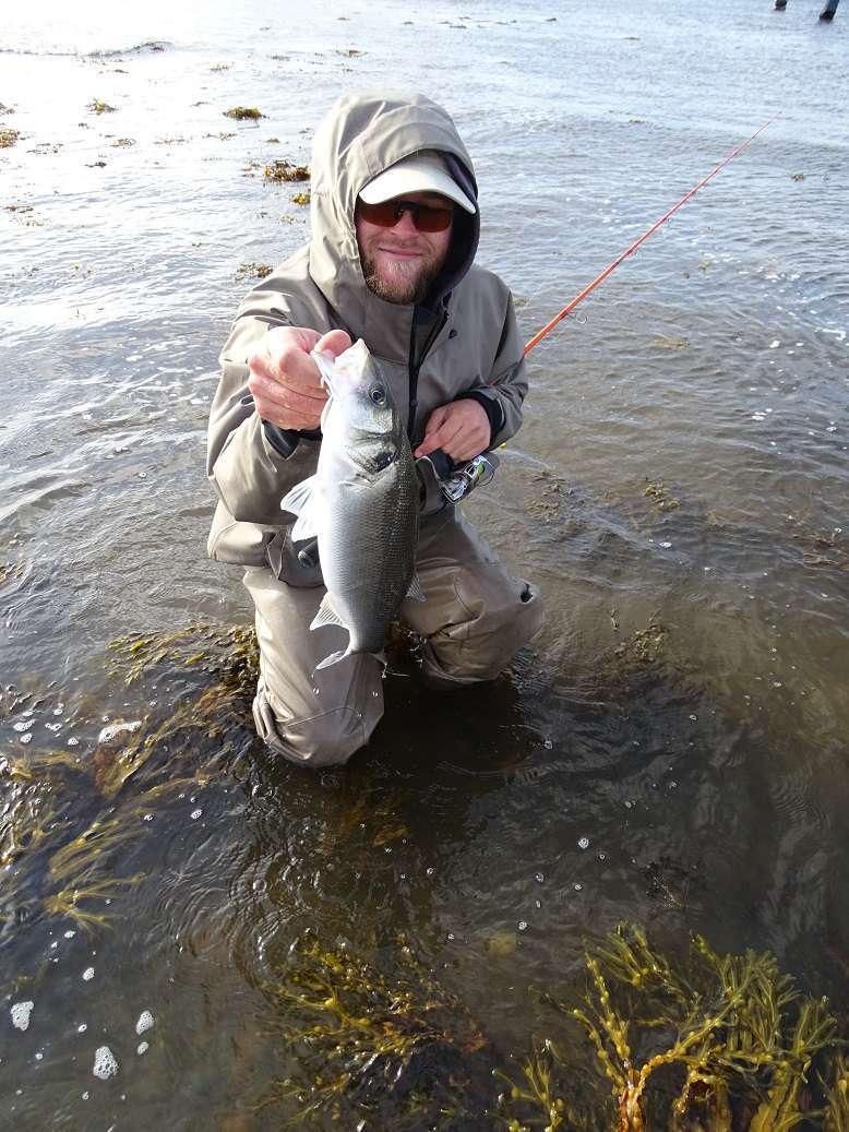 Jeudi: Dernière tentative pour que j’ai un bar à fêter au pub ce soir. Kilian nous accompagne ce matin et nous donne quelques trucs et astuces pour pêcher ce poisson, nettement plus difficile à trouver que les lieus ! Il fait très froid et en waders dans l’eau je perds rapidement l’usage de mes jambes ! Nous sommes partis aux aurores mais comme lors des autres sessions, le spot ne semble s’animer qu’en fin de montante. Un décroché pour Olivier puis pour Kilian qui en perd un beau avant d’en sortir un tout de suite derrière au ls
