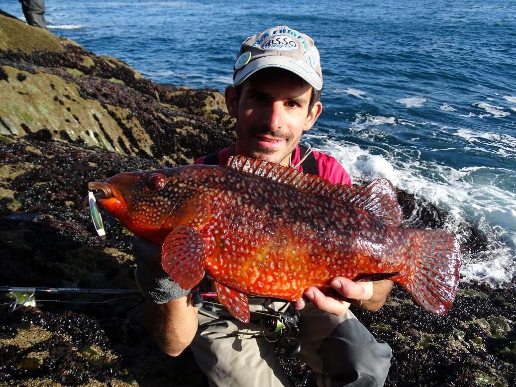 Comme la houle est bien tombé je tente les vieilles au bord, au pied du tombant. Le Blue equille jr 10gr est parfait pour ça car il plonge très vite, il tient bien le fond sans s’accrocher, il a un hameçon super solide et il plaît beaucoup aux veilles ! Je ferais ainsi 9 veilles de taille sympa, j’adore vraiment cette pêche faite de petites touches sèches et de combats ultra violent