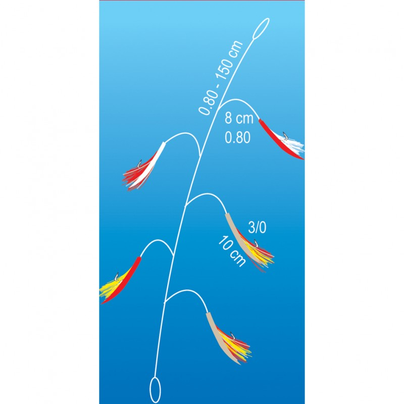 Composé de 3 hameçons N°3/0 avec tubes silicones, plumescouleurs sur du Nylon en 80/100 (empiles 6 cm) .
