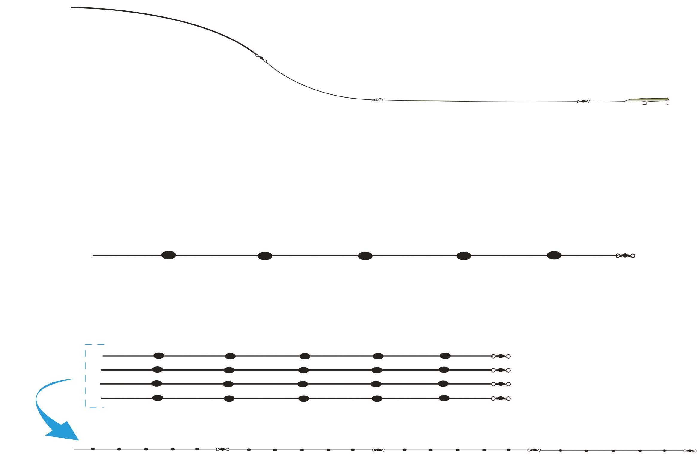 1 baril à agarfe et en terminal 50 cm de Nylon en 50/100 avec 3 leurres au choix (1 anguillon rouge en 3/0), 1 cuiller martelée de 40 mm, ou un lançon coloris naturel de 14 cm (hameçon N° 2/0). Rotation : 4 émerillons séparent les différentes partie pour une excellennte rotation.