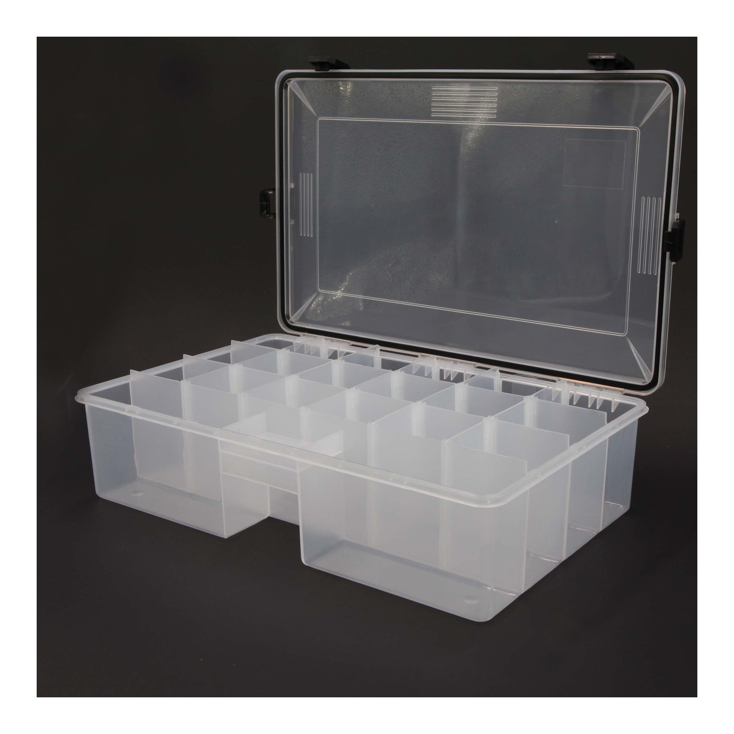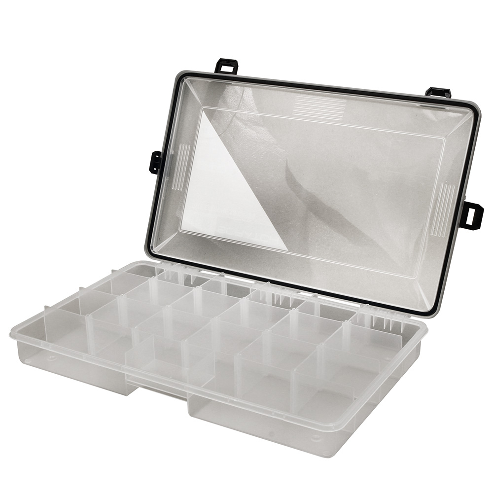Boîte de rangement en plastique spéciale pêche, bricolage. La série WATERPROOF est étanche à la submersion. Le couvercle transparent permet de visualiser rapidement le contenu. Les compartiments modulables vous donnent le loisir d'organiser les cases selon le volume de votre matériel.