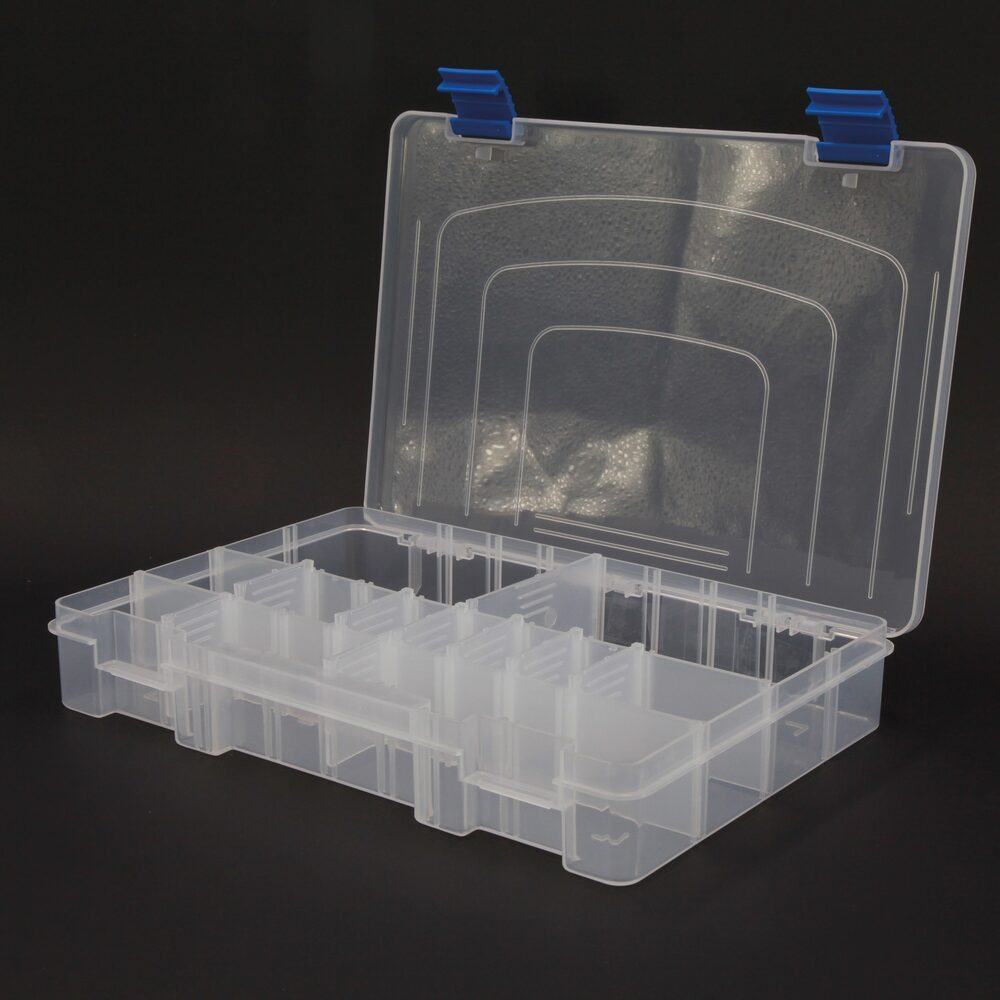 Boîte de rangement en plastique spéciale pêche, bricolage. Le couvercle transparent permet de visualiser rapidement le contenu. Modulables, vous pouvez organiser les compartiments comme vous le souhaitez.