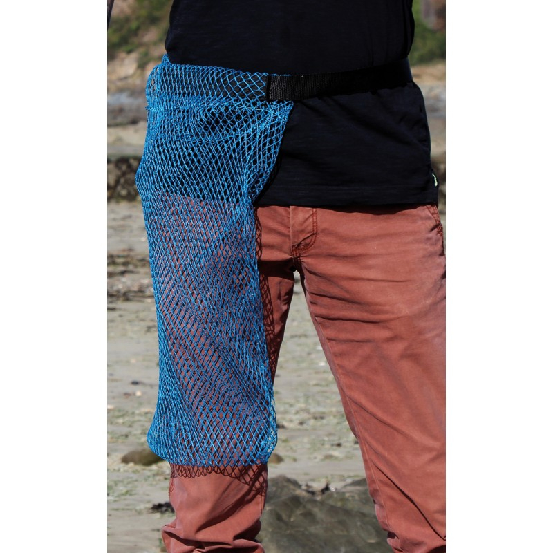 Sac en Nylon de maille de 6 mm pour la conservation des poissons, coquillages, ... Ceinture clipsée à la taille réglable, fermeture elastique.