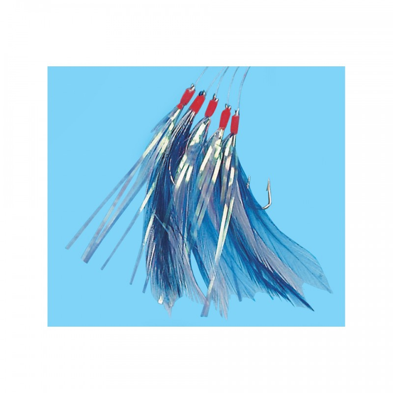 Plumes de mer véritables montées avec filaments aux reflets arc-en-ciel. Montage de qualité pour les maquereaux, chinchards, orphies, bars,… Nylon 90 cm en 40/100 - 3 hameçons N° 1/ 0. Conseil : Plombez la ligne avec une cuiller flashmer. Les reflets flashants de la cuiller attireront les poissons prédateurs
