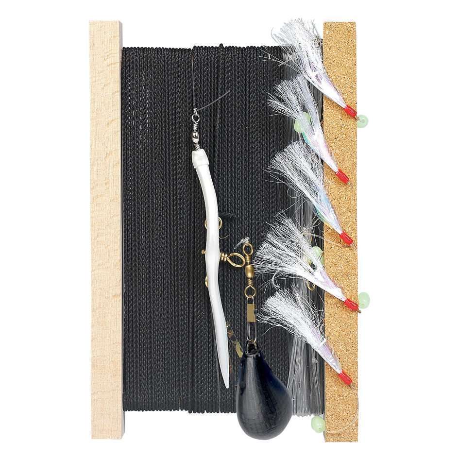 Montée sur un plioir en bois avec bande liège pour fixer les hameçons (La ligne est attachée au plioir). Longueur totale : +/- 60 m.